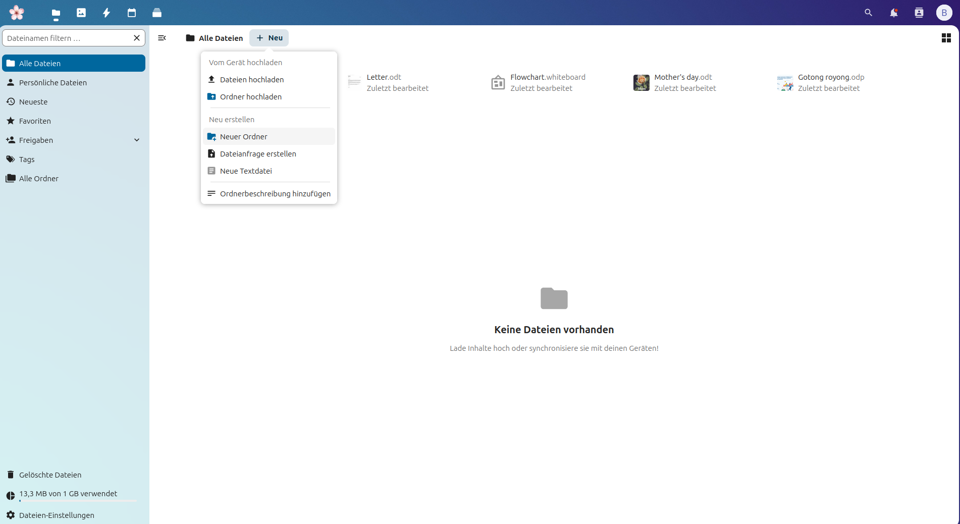 Anschließend werdet ihr vom Hauptbildschirm mit einigen standardmäßig angelegten Dateien begrüßt.