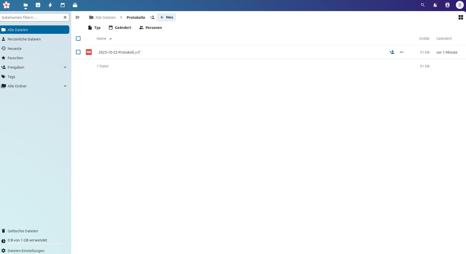 Wir erstellen einen Ordner Protokolle, der nach dem Anlegen wie folgt angezeigt wird.