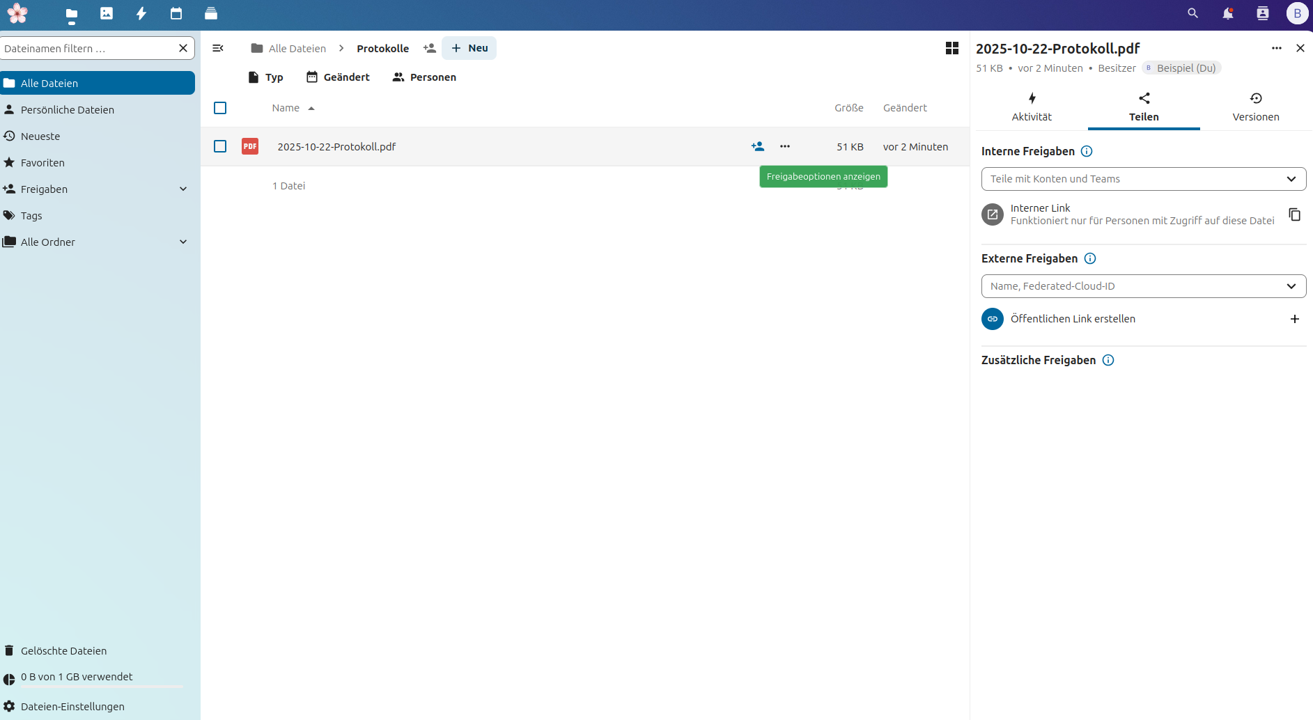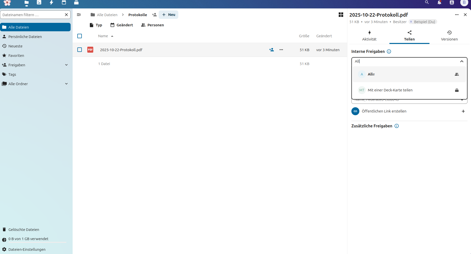 Anschließend kann diese Datei mit einzelnen Personen oder an die Gruppe „Alle“ geteilt werden. Dazu geht man auf das Personensymbol mit dem Pluszeichen neben der Datei und wählt „Interne Freigabe“.