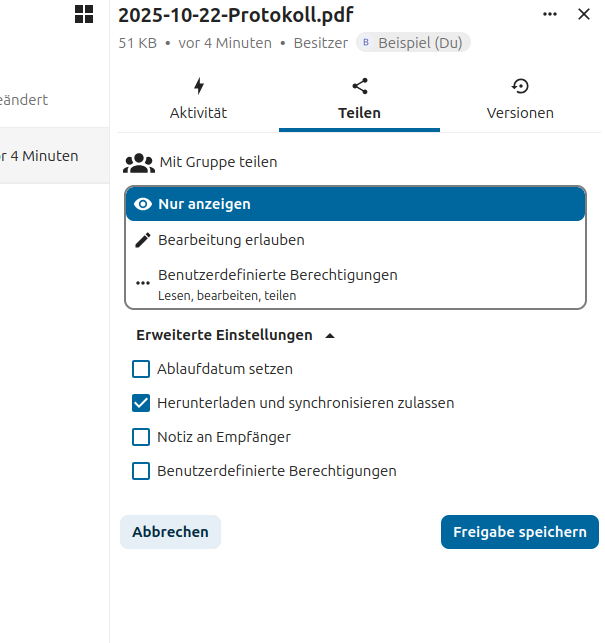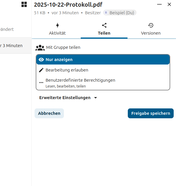 Anschließend kann man festlegen, ob andere Personen die Datei bearbeiten oder nur lesen können.