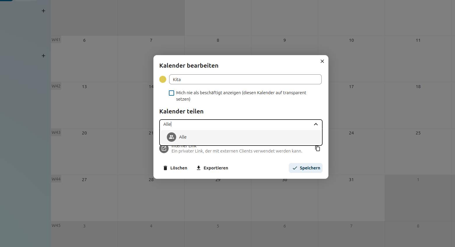 Es können weitere Kalender angelegt und natürlich auch wieder an „Alle“ geteilt werden.