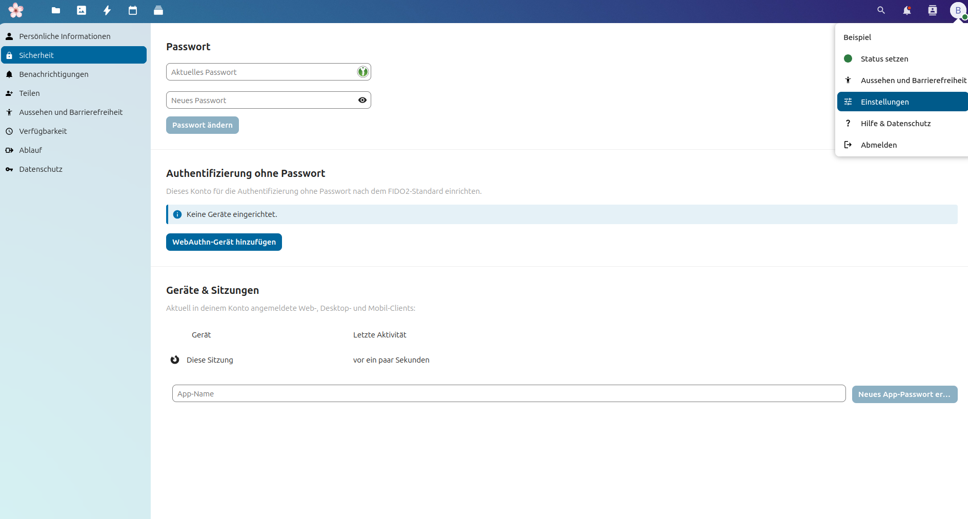 Passwörter können über das Benutzerkonto oben rechts in der Ecke über „Einstellungen“ geändert werden.